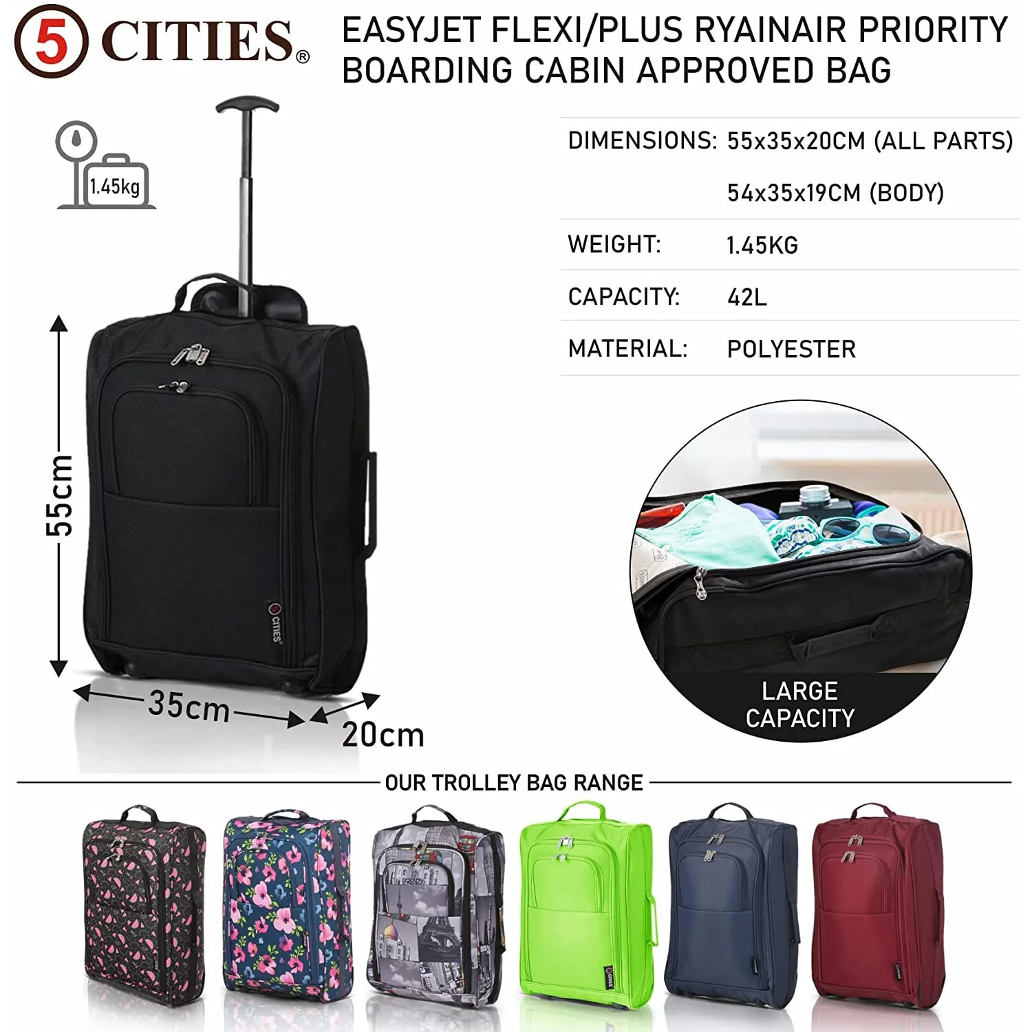 5 Cities Leichtgewicht Handgepäck Kabinentrolley Rollkoffer Gepäck Reisetasche Bordgepäck mit Rädern für Lufthansa, Eurowings, TUIfly, Sun Express, Easyjet, Ryanair, British Airways, Jet 2 und viele andere Airlines 55x35x20cm 42L