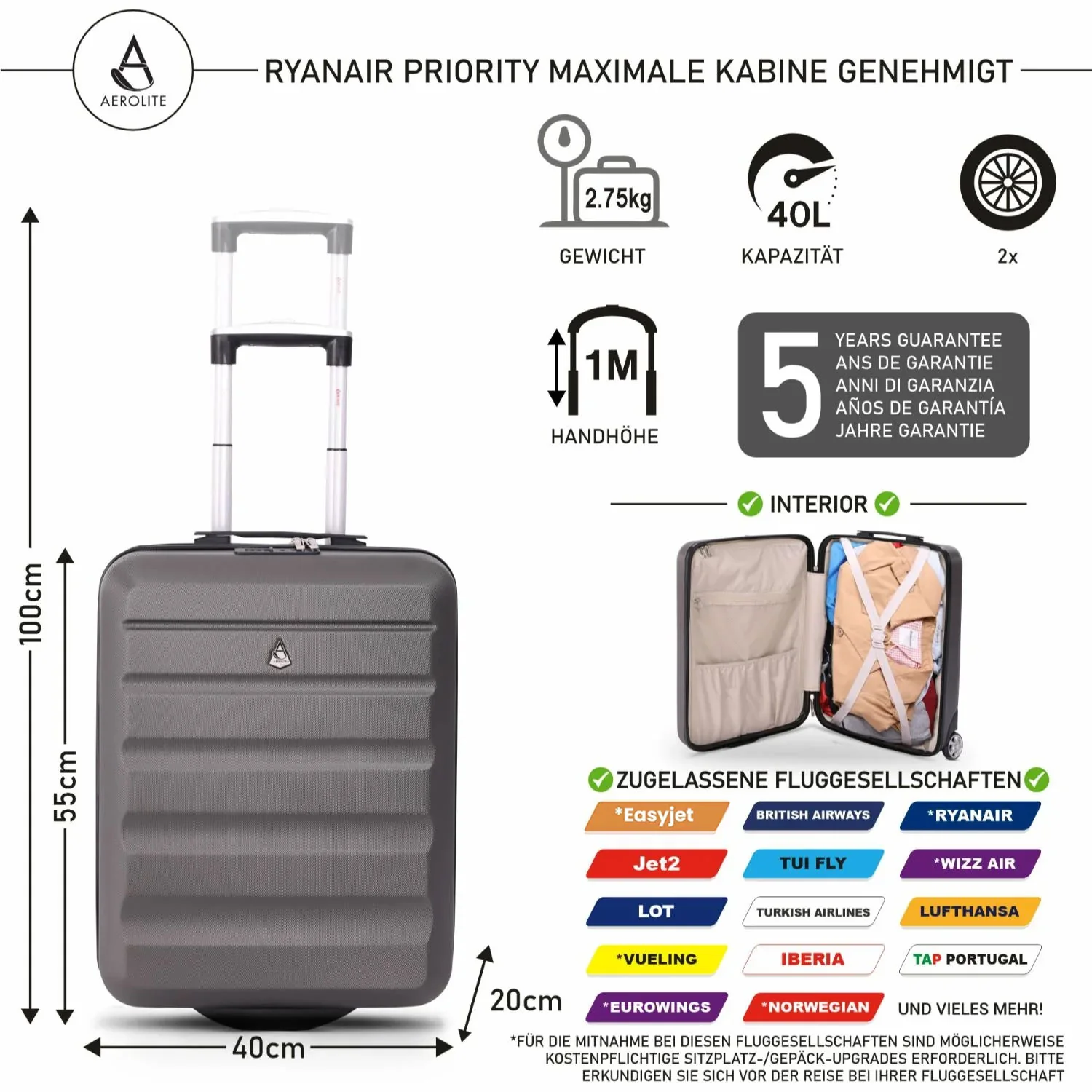 - Packen Sie das Maximum für viele Fluggesellschaften: Bei Aerolite wissen wir, dass es frustrierend ist, wenn Sie nicht alles packen können, was Sie wollen. Deshalb haben wir diesen Koffer speziell für die maximal zulässige Kabinengröße (55 x 40 x 20) für einige der beliebtesten Fluggesellschaften in Europa entwickelt – einschließlich Ryanair Priority Boarding, Tap Portugal, TUI und Vueling. Es passt auch vielen anderen! Maße: 55 x 40 x 20 cm (eingezogen, inkl. Rollen und Griff), 50 x 40 x 20 cm (Exc. Rollen und Griff), Höhe (Griff ausgezogen) 1 m, Gewicht 2,75 kg, Fassungsvermögen 40 l