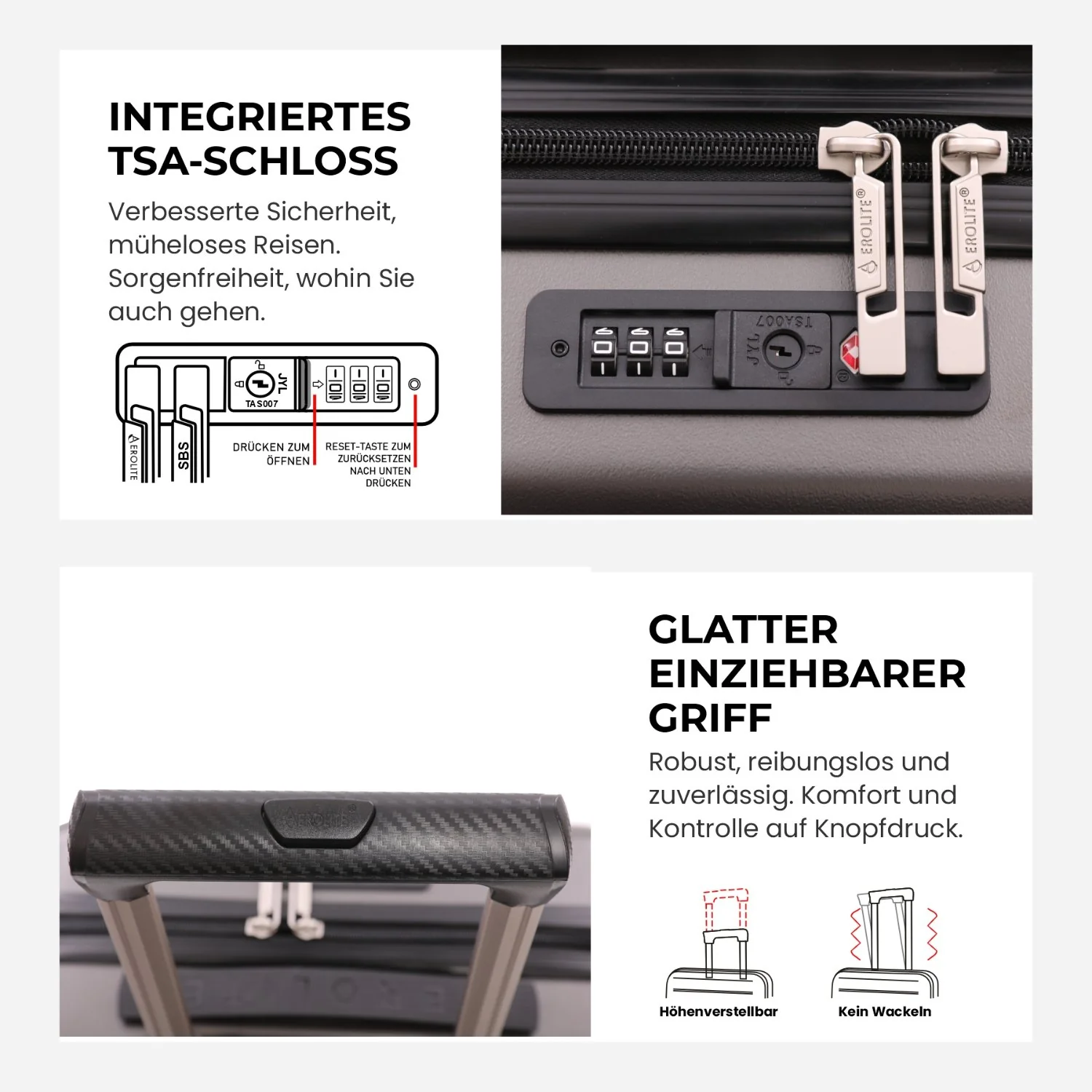 - TSA-zugelassenes Schloss: Das integrierte TSA-Kombinationsschloss schützt Ihr Gepäck und ermöglicht Sicherheitskontrollen am Flughafen ohne Beschädigung.