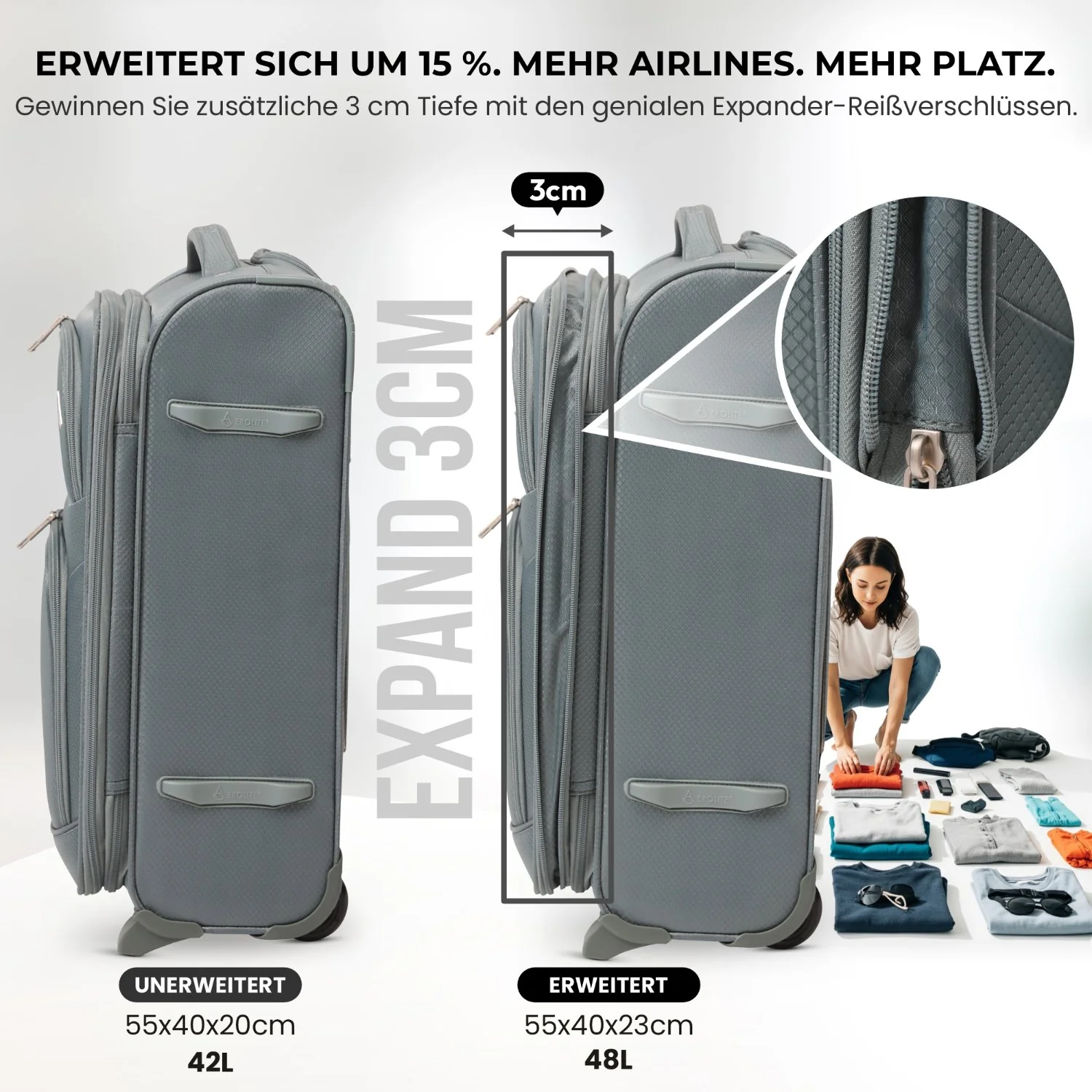 Airline-optimierte Größe für Europa: Die Grundgröße 55x40x20 cm ist Ryanair Priority kompatibel, während die erweiterte Größe 55x40x23 cm der maximalen Handgepäckgröße bei Lufthansa, Wizz Air und Eurowings entspricht.