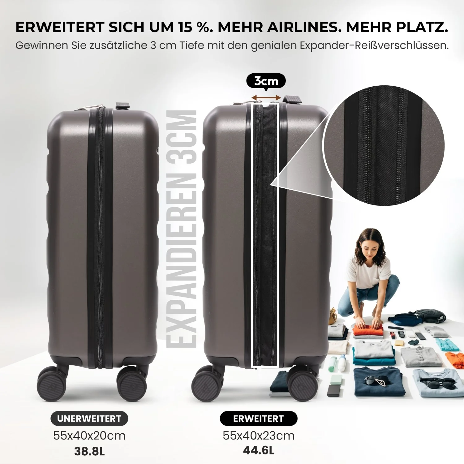- Erweitert (55x40x23cm): Entspricht der maximalen Kabinengröße für Lufthansa, Wizz Air Priority, Eurowings, Turkish Airlines und viele weitere.