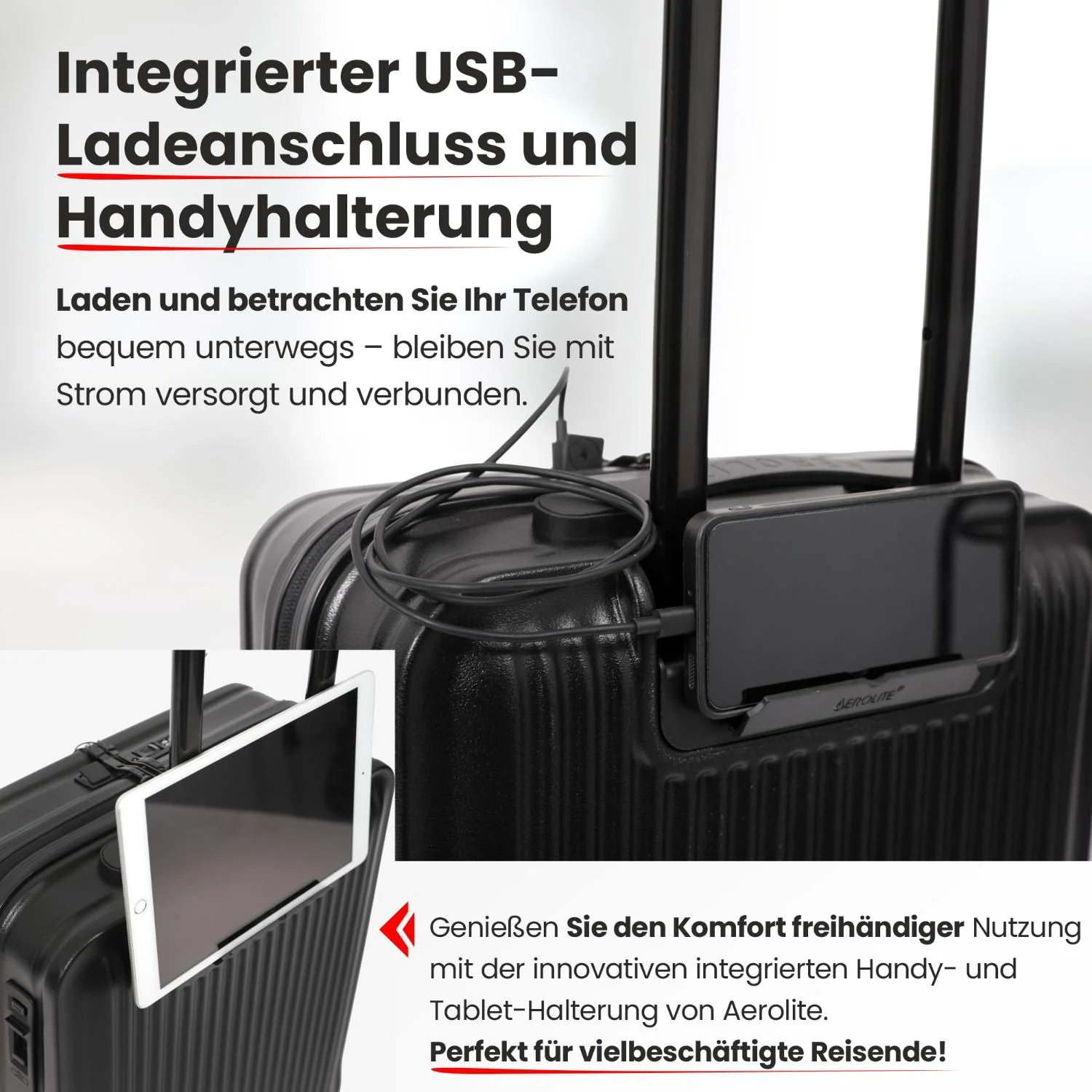 - Exklusive intelligente Funktionen - Dieser Koffer wurde für moderne Reisende entwickelt und verfügt über ein spezielles Laptop- und Tablet-Fach auf der Vorderseite, eine integrierte Telefonhalterung, einen USB-Ladeanschluss (Powerbank nicht im Lieferumfang enthalten) und einen doppelten Getränkehalter für höchsten Komfort.