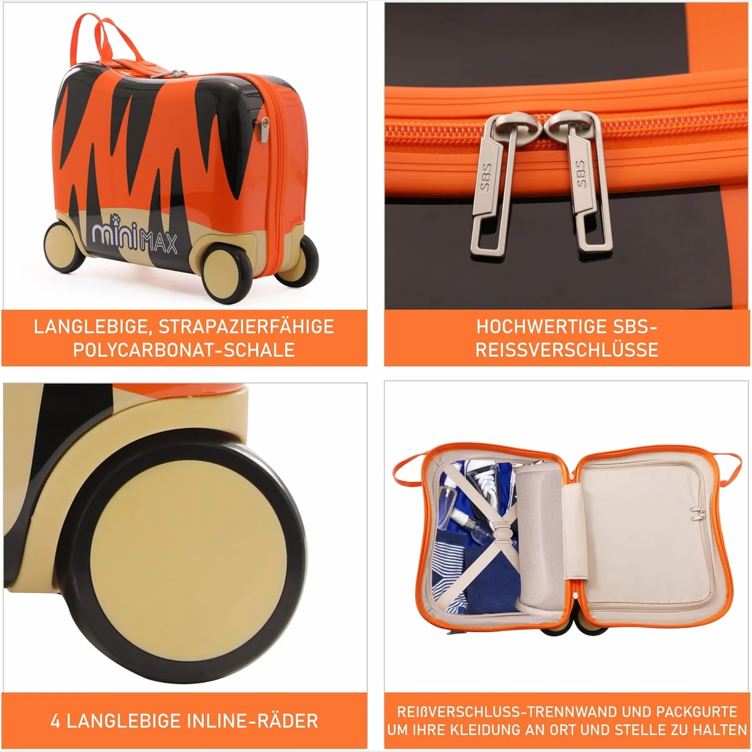 MiniMax 45x36x20cm 29L Kinder-Ride-On-Koffer 4er-Set inkl. Kordelzugbeutel, Nackenkissen & 50+ Personalisierungsaufkleber, EasyJet Max Größe Kinder-Rollkoffer Handgepäck 45x36x20 (Tiger)